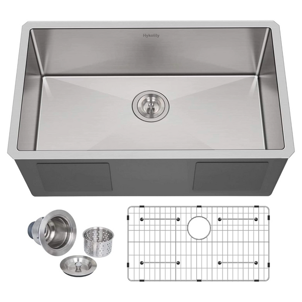Hykolity 32-inch Undermount Kitchen Sink, 16 Gauge Single Bowl Stainless Steel Kitchen Sink with Strainer & Bottom Grid, 32" x 19" x 9"