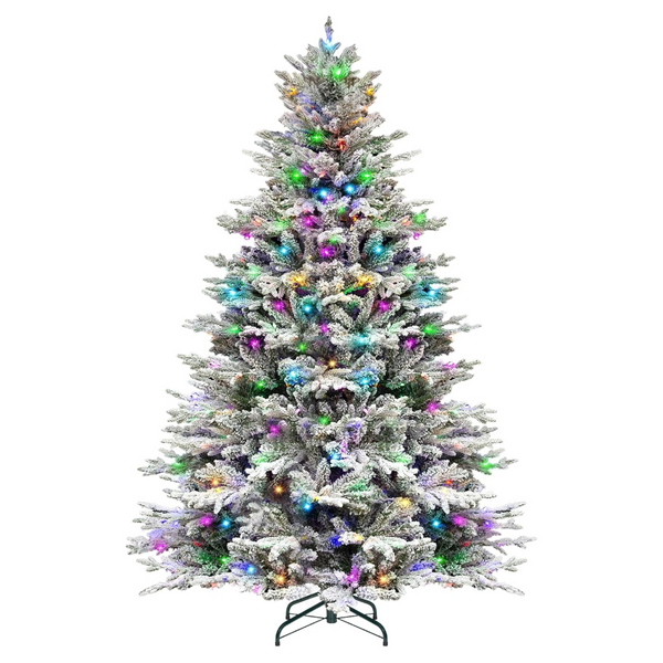 Hykolity 6.5'/7.5' Premium Prelit Snow Flocked Christmas Tree with 11 Modes LED Lights, Branch Tips, Metal Stand and Hinged Branches