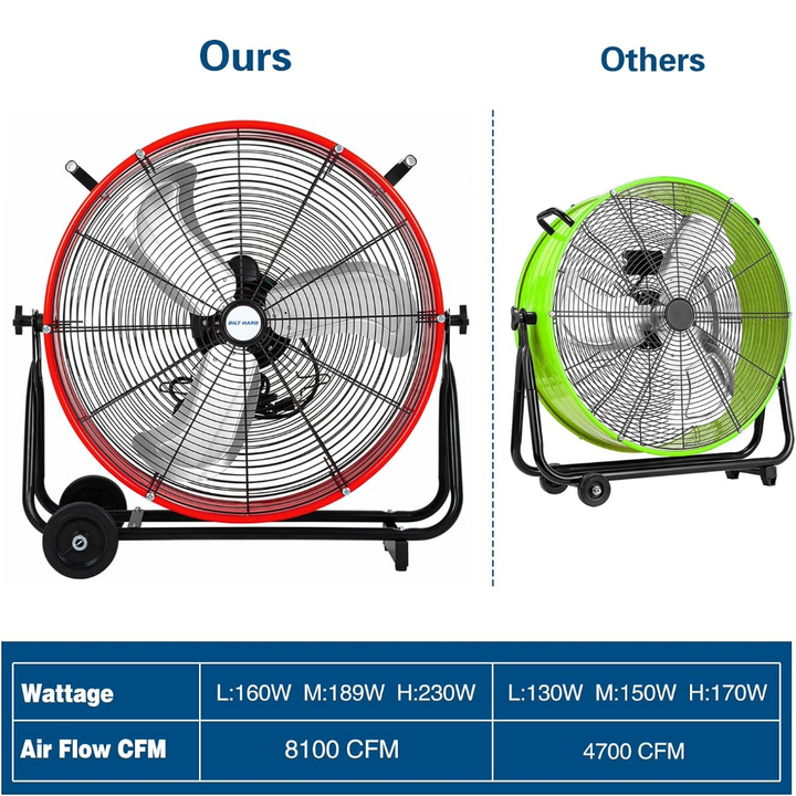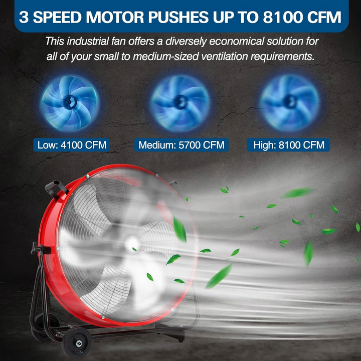 This industrial drum fan features a powerful motor and two speeds (Low 4100 CFM / High 8100 CFM), providing massive airflow for ventilating large areas. It's ideal for garages, basements, covered patios, workshops, warehouses, and factory stations.