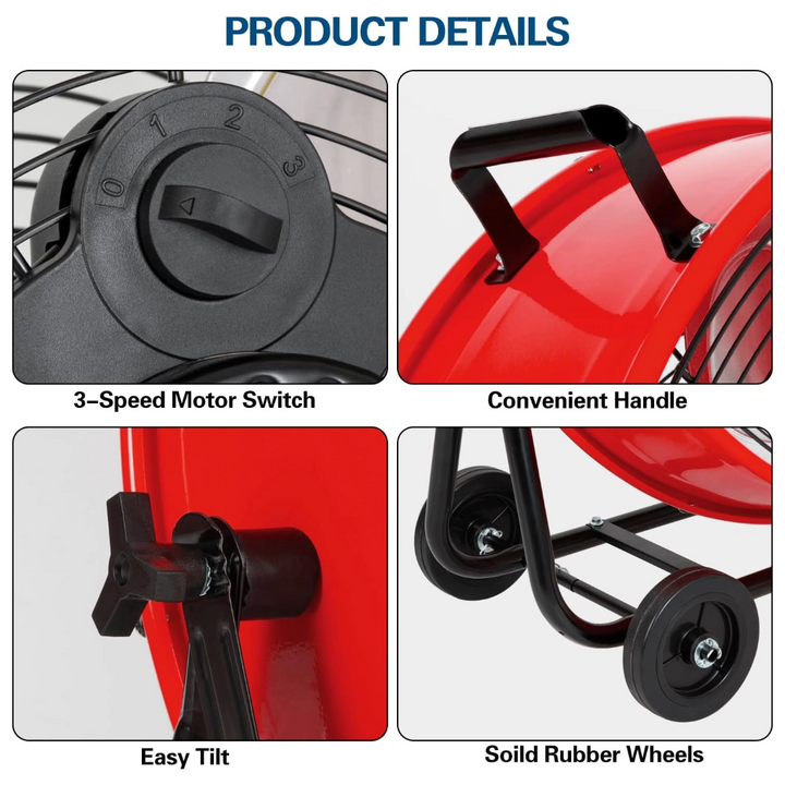 With a 180-degree tilt, this high-velocity heavy-duty metal fan can be adjusted to direct airflow precisely where you need it. Easily tilt the fan up or down to target the airflow.