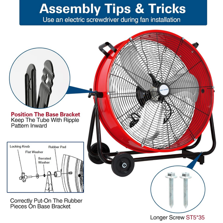 BILT HARD 24" 8100 CFM High Velocity Industrial Drum Fan, 3-Speed Heavy Duty Metal Red Shop Fan for Warehouse, Workshops, Garage, Factory and Basement, UL Listed
