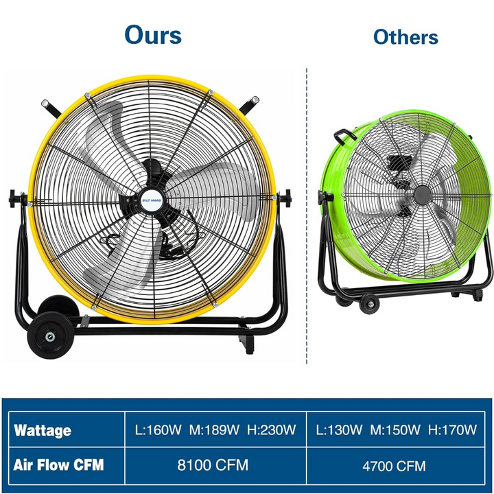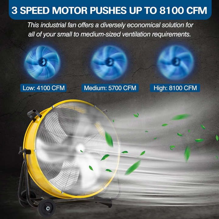 This industrial drum fan features a powerful motor and two speeds (Low 4100 CFM / High 8100 CFM), providing massive airflow for ventilating large areas. It's ideal for garages, basements, covered patios, workshops, warehouses, and factory stations.