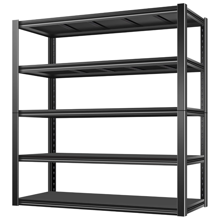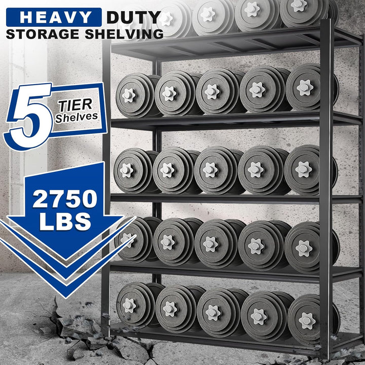 • 5-Tier Storage Shelves – Each shelf holds up to 550 pounds (evenly distributed), with a total maximum load weight of 2750 pounds, making it ideal for garages, basements, workshops, and more.