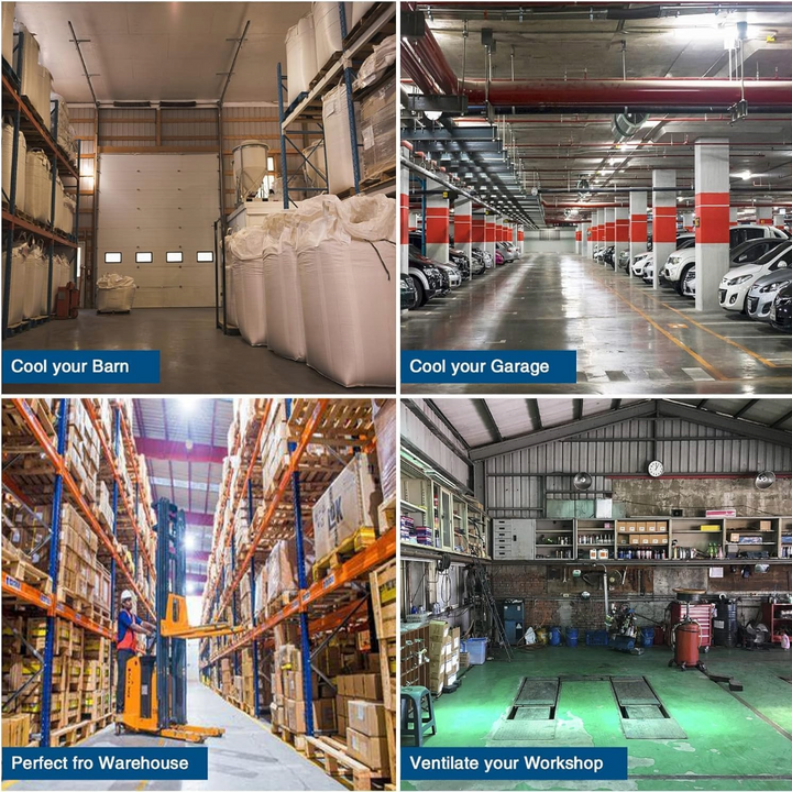 This high-velocity fan is designed with 3-speed settings: High, Medium, Low (9500 CFM, 5900 CFM, 4700 CFM), running at a maximum of 1134 RPM and drawing 1.54 amps. It is ideal for indoor large spaces such as industrial areas, commercial buildings, warehouses, greenhouses, workshops, garages, and factory stations.