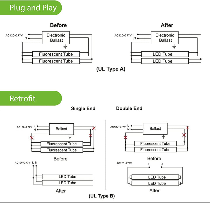 ✅ Bypass de balasto: el tubo de luz LED T8 es un cable directo que no es compatible con balasto. Estos tubos requieren que el lastre se desconecte y se retire del accesorio antes de la instalación, solo consulte la imagen de la guía de instalación para obtener más detalles.