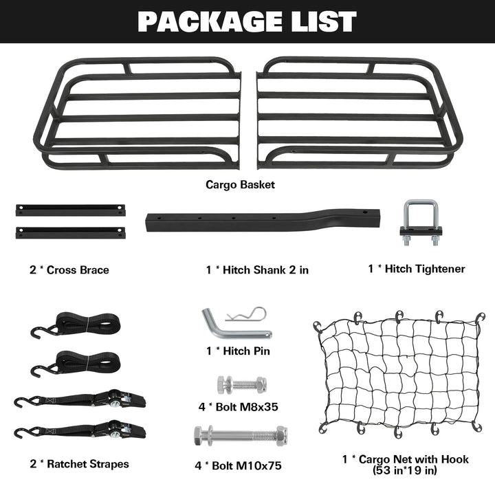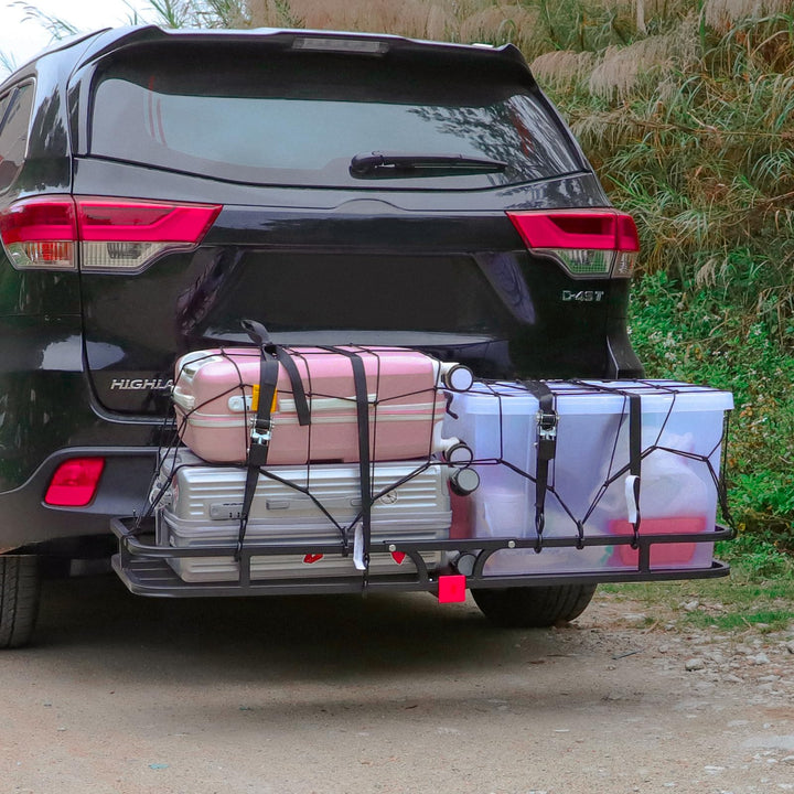 Extra Storage Capacity: With overall dimensions of 53" x 19", this hitch cargo basket offers abundant space for extra storage, allowing you to carry more items on the rear of your vehicle. This travel storage solutions help keep your car's interior comfortable and organized, making it ideal for long trips, family vacations, and camping adventures. Whether you're transporting tents, luggage, outdoor gear, or sports equipment, this heavy-duty cargo carrier ensures you have the space you need for an enjoyable journey.