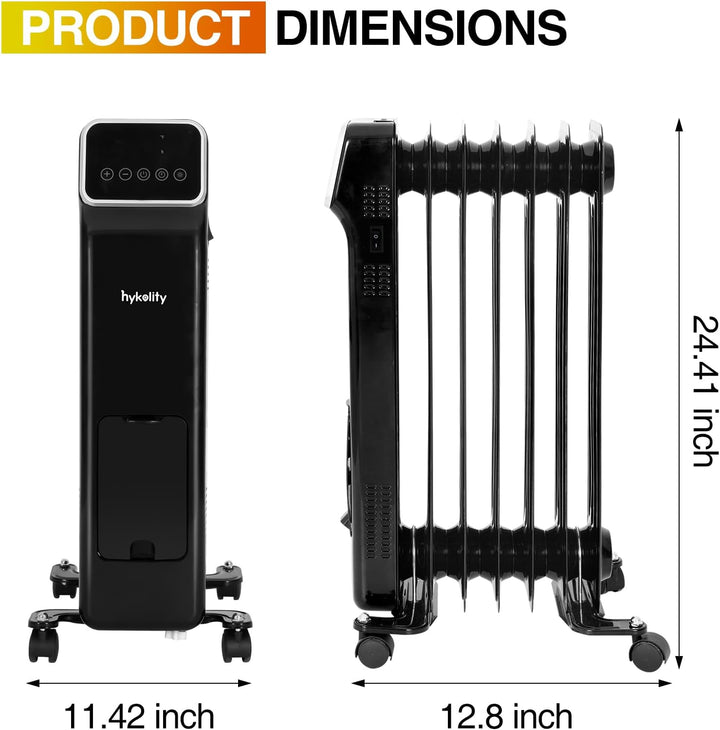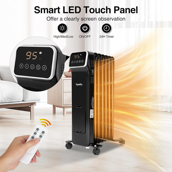 Hykolity 1500W Oil Filled Radiator Heater with Remote Control, Electric Space Heater with 3 Heating Modes & 24H Timer, Adjustable Thermostat, Overheat & Tip-Over Protection for Home, Indoor Use, Black