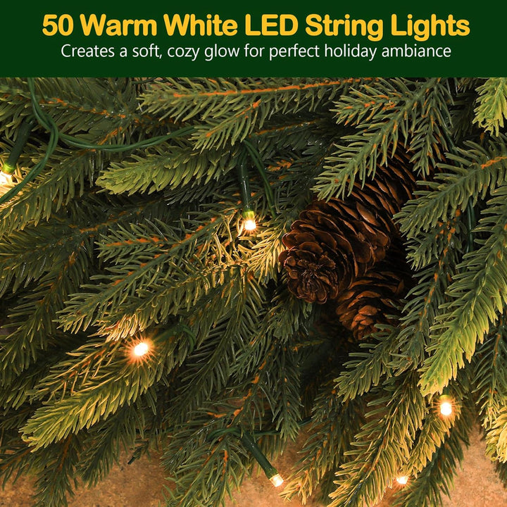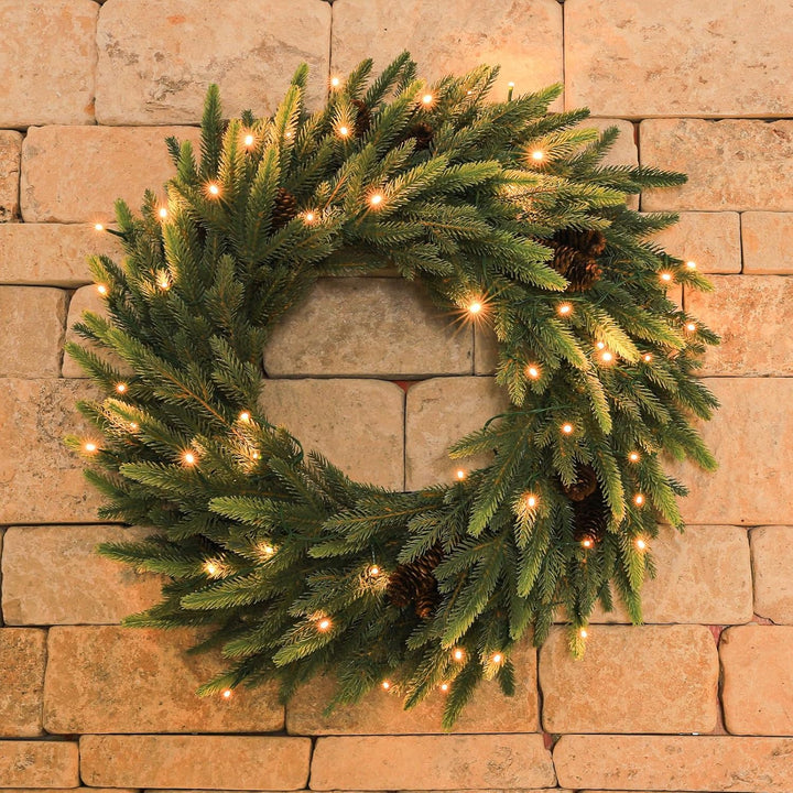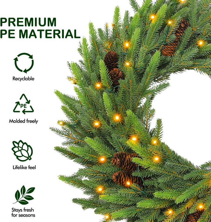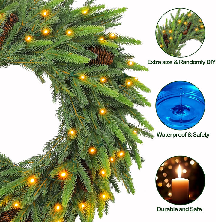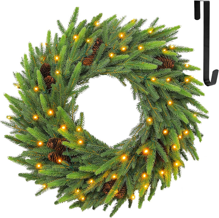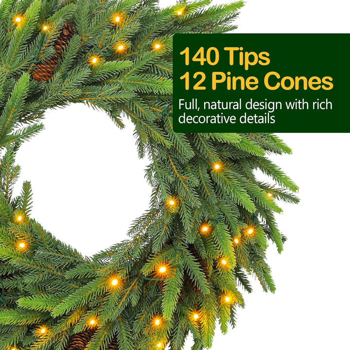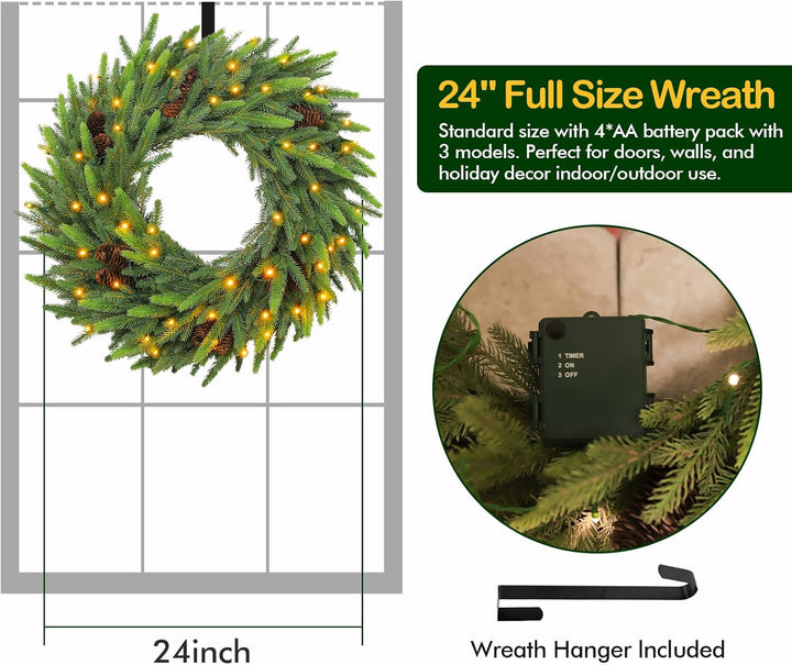 This elegant 24-inch PE wreath features 140 lifelike tips and 12 natural pine cones, pre-lit with 50 warm white LEDs for instant holiday charm. Powered by 4AA batteries (not included) with a built-in 6-hour timer, it offers cordless convenience and automatic daily operation. The flexible design allows easy shaping, creating a cozy, energy-efficient glow perfect for doors, walls, or windows—ready to display straight out of the box.
