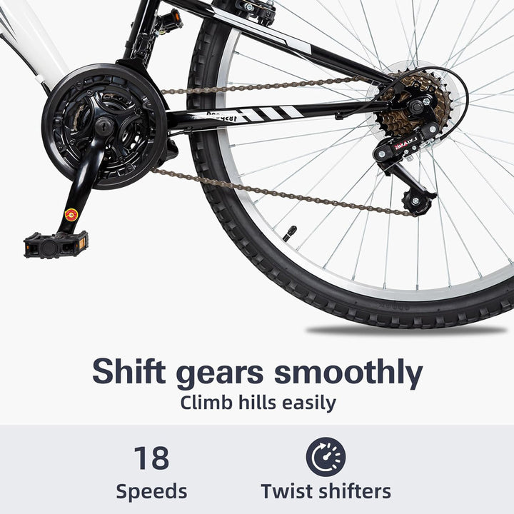 Navigate diverse terrains with confidence thanks to the responsive **18-Speed gearing system**, ensuring you have the right power for climbs and descents. Experience unparalleled smoothness with **Full Suspension**, including a dedicated mid-shock absorber that effectively absorbs impacts, transforming rough trails into enjoyable rides. **Reliable V-Brakes** provide strong, consistent stopping power for ultimate control.