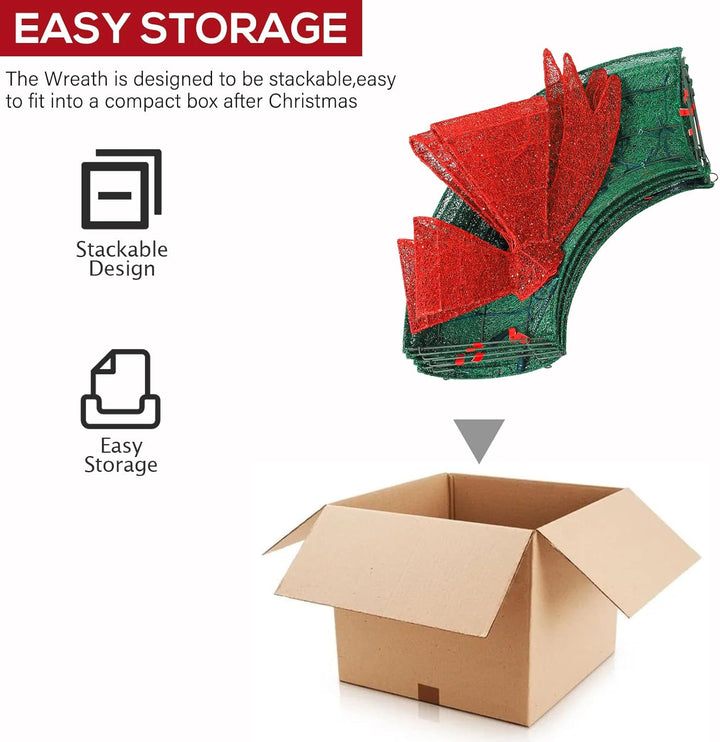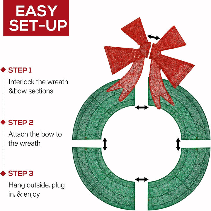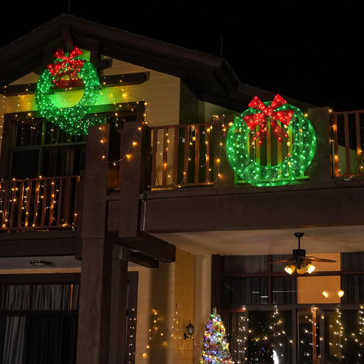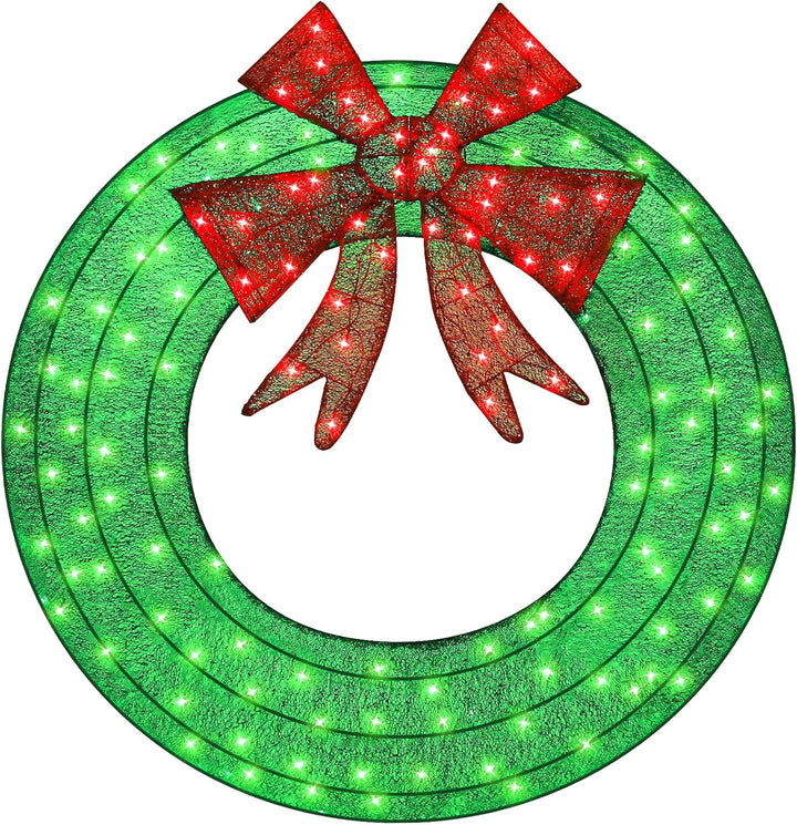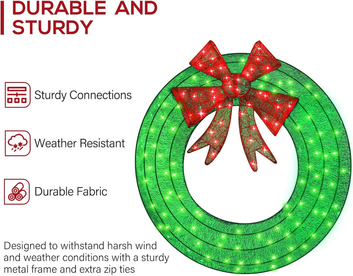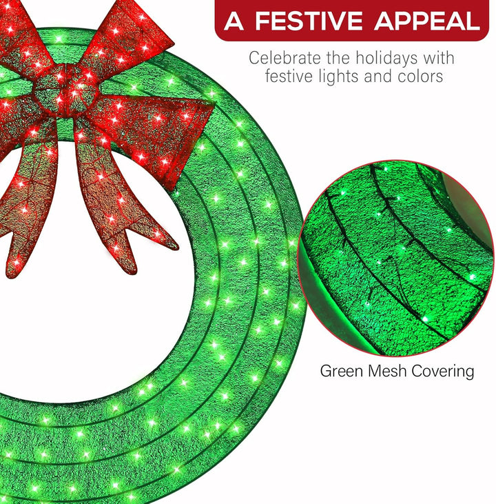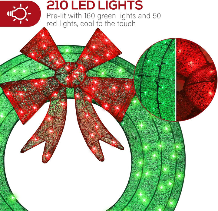 • Hykolity 60 in. 3D Lighted Outdoor Christmas Wreath with 210 LED Lights & Red Bow, Christmas Holiday Yard Decoration for Garden, Porch - Green
