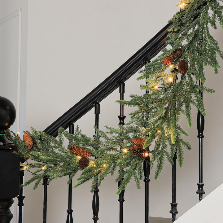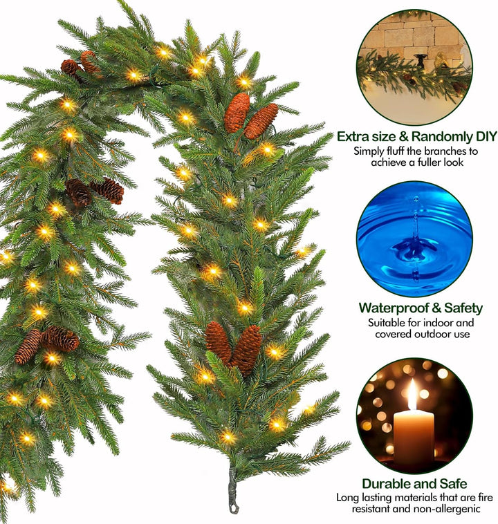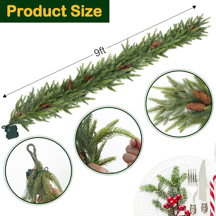 • Hykolity 9 ft. PE Pre-lit Christmas Garland with 50 Warm White Lights, Connectable Garland with Timer, 150 PE Tips, 16 Pinecones for Christmas & Wedding Decor, Stairway or Windows, Battery Operated