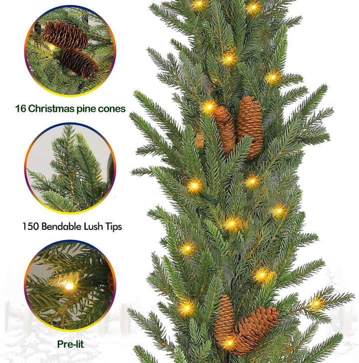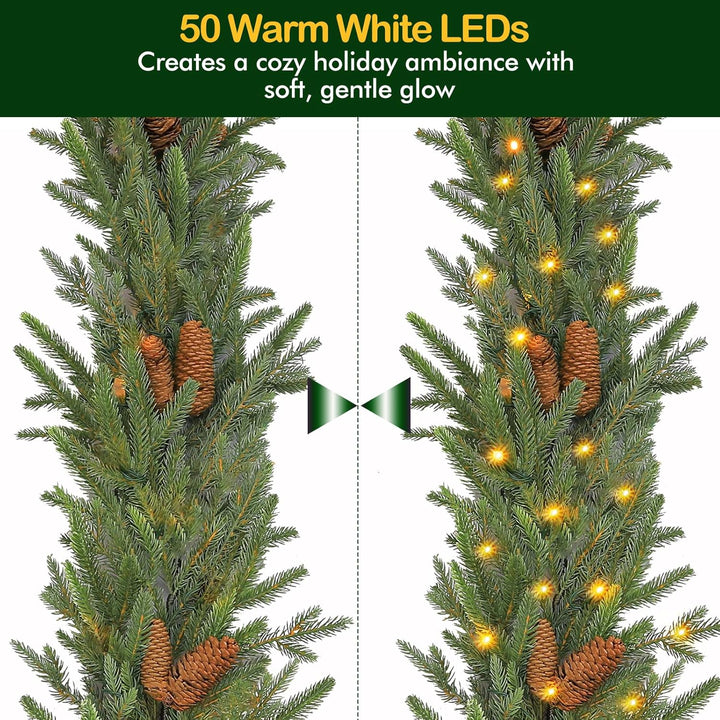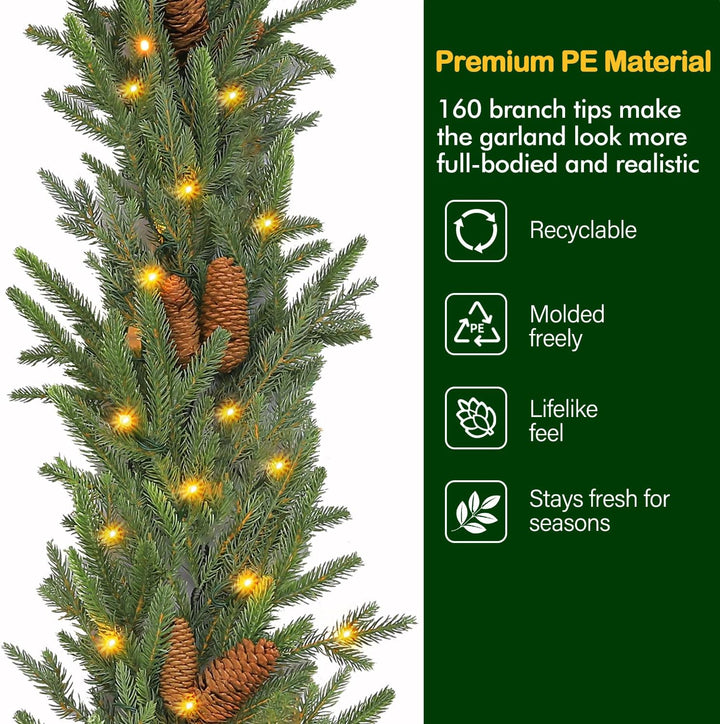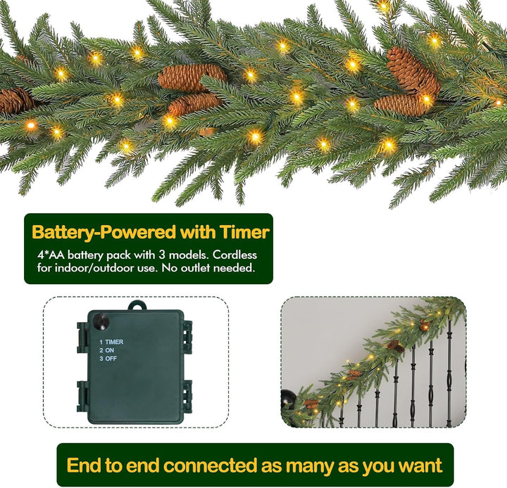 Hykolity 9 ft. PE Pre-lit Christmas Garland with 50 Warm White Lights, Connectable Garland with Timer, 150 PE Tips, 16 Pinecones for Christmas & Wedding Decor, Stairway or Windows, Battery Operated