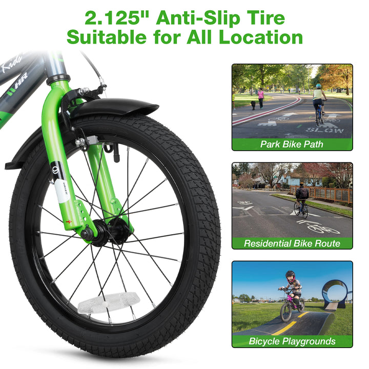 Give your young rider the perfect start with this rugged and feature-packed 16-inch kids' bicycle, designed for maximum fun and safety. It's engineered for boys and girls aged 4 to 6 years old, fitting children with a height range of 38 inches to 48 inches comfortably. This children's bike is built for exploring, featuring extra-wide 2.125-inch tires that provide superior grip and stability, allowing for smooth riding on driveways, trails, and virtually all-terrain.