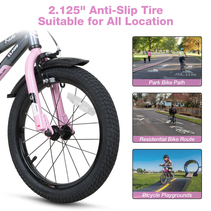 Give your young rider the perfect start with this rugged and feature-packed 16-inch kids' bicycle, designed for maximum fun and safety. It's engineered for boys and girls aged 4 to 6 years old, fitting children with a height range of 38 inches to 48 inches comfortably. This children's bike is built for exploring, featuring extra-wide 2.125-inch tires that provide superior grip and stability, allowing for smooth riding on driveways, trails, and virtually all-terrain.