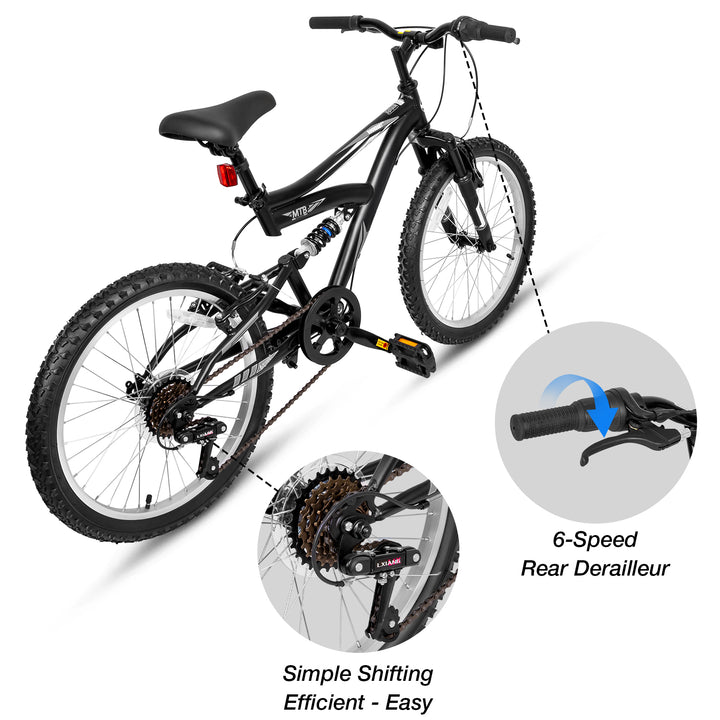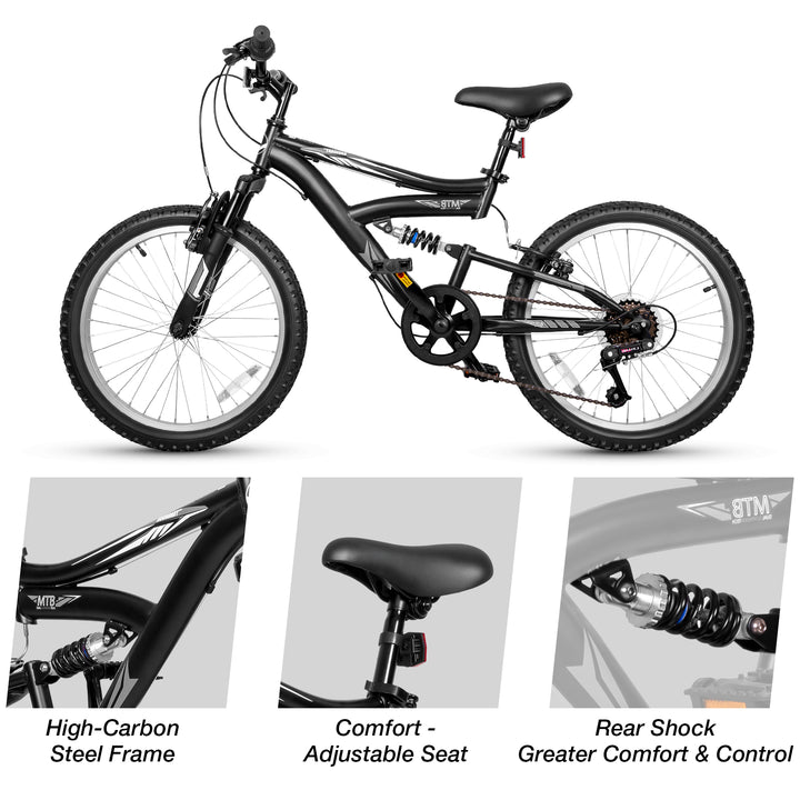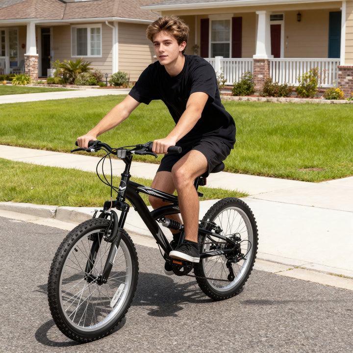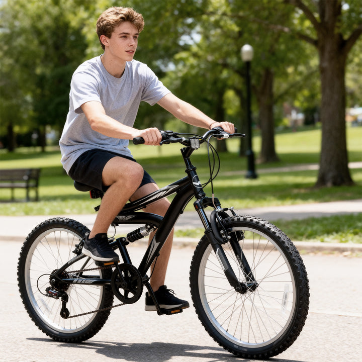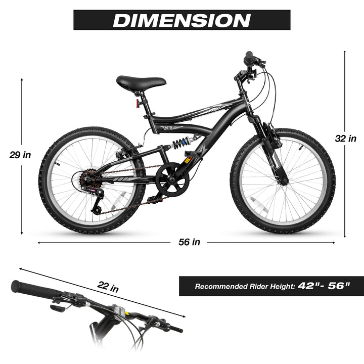 • Hykolity Kids Mountain Bike 20 inch MTB Bicycle Age 6-12 Years Height 42-56 in Tween Cycling Full Suspension Sport Outdoor Bikes - Jet Black