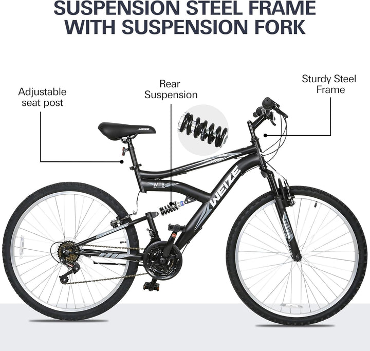 Designed for riders who love the outdoors, this durable steel dual-suspension mountain bike is ready to take on rugged trails, dirt paths, rocky trails, and pavement. With a front suspension fork and rear coil shock, it smooths out bumps so you can enjoy a more comfortable ride.