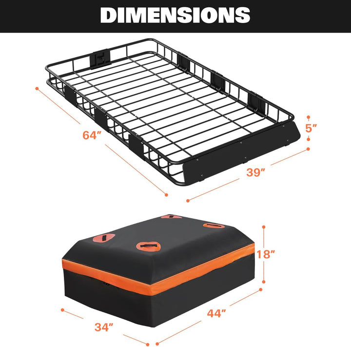 QEDDI Heavy Duty Roof Rack Carrier Basket Universal Rooftop 64" X 39" X 5" + Waterproof Cargo Bag and Net with Attachment Hooks, Ratchet Straps, 200lb Capacity