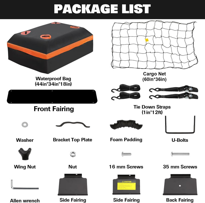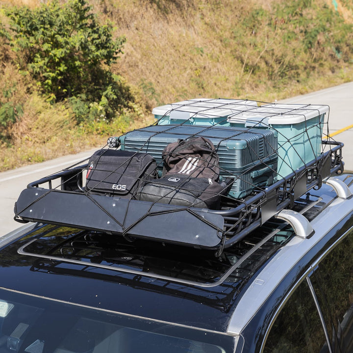 Comes complete with 2 heavy-duty 12ft tie-down straps (2200 lbs capacity) and a 36"x60" cargo net to secure tents, luggage, toolboxes, and more — keeping your load stable and protected on the go.
