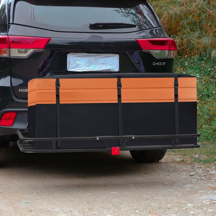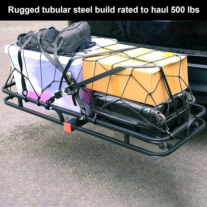 • QEDDI Hitch Cargo Carrier Basket 53" X 19" with Waterproof Cargo Bag, Stabilizer, Net and Ratchet Straps, 500 lbs Hauling Weight Capacity Folding Hitch Cargo Rack for SUV Pickup