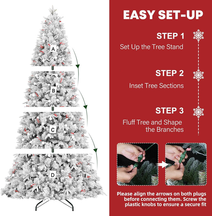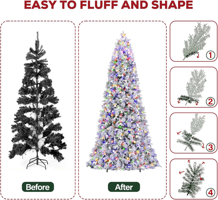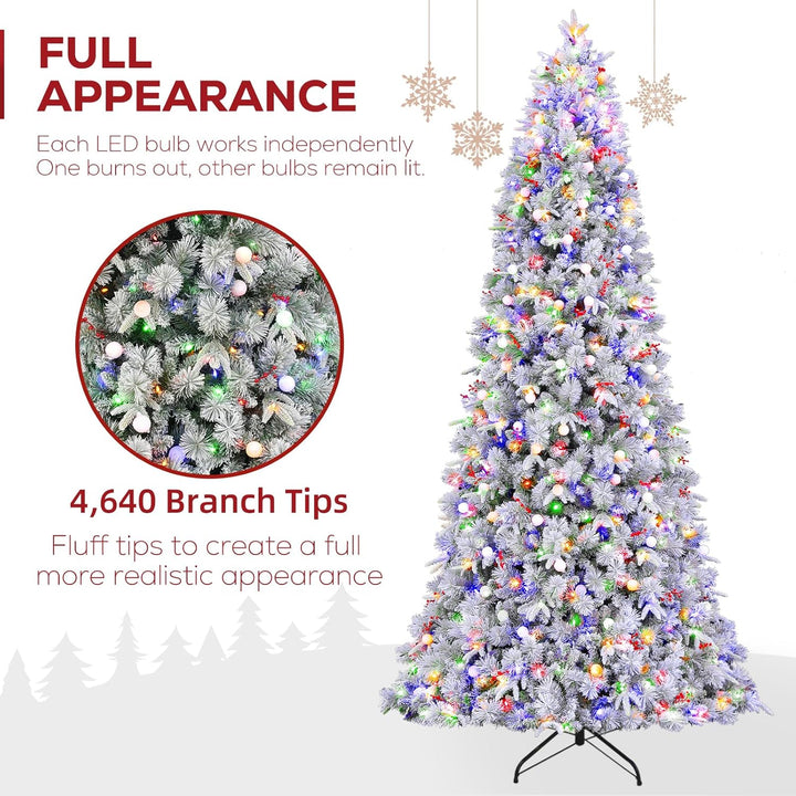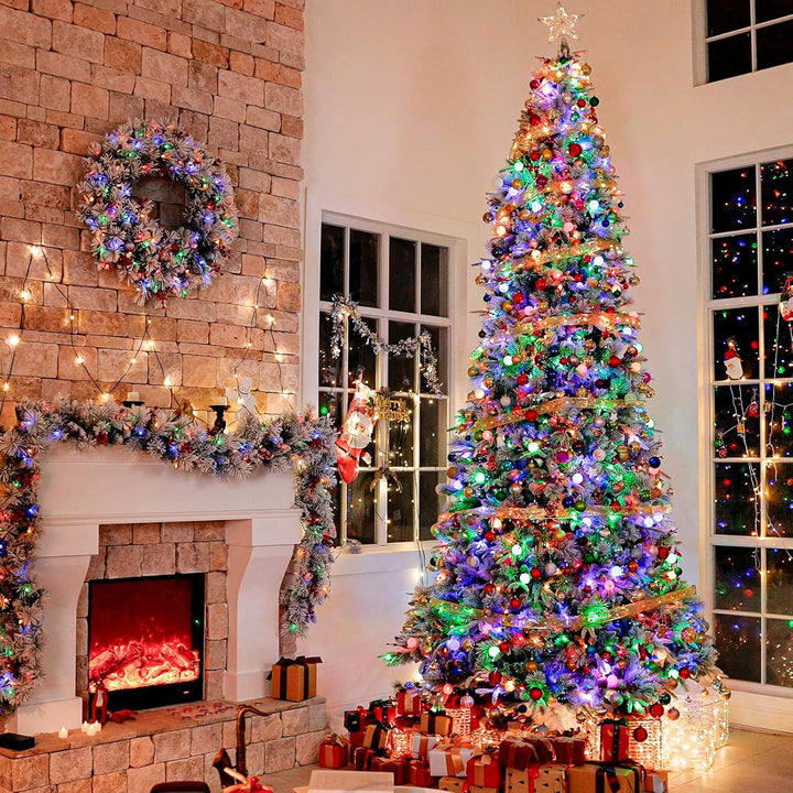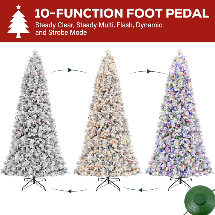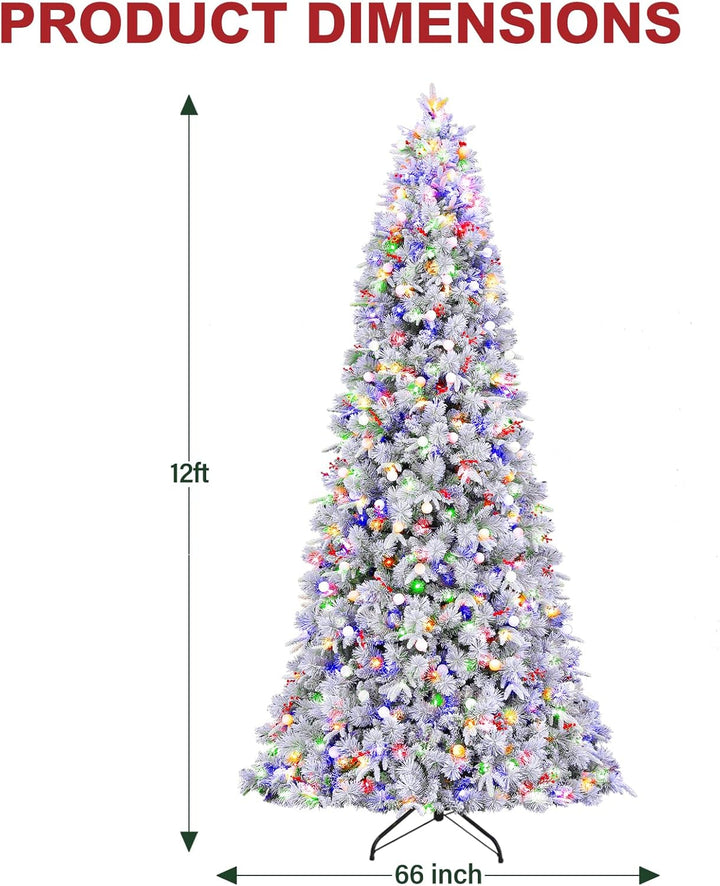 Natural & lush 12 ft Snow Flocked Christmas Tree with 4,640 PE & PVC branch tips. Features 850 dual-color LED lights (130 G-50 caps) with 10 modes, switchable between warm white and multicolor using a convenient foot pedal.