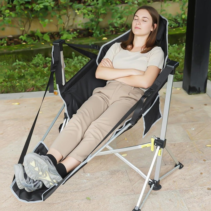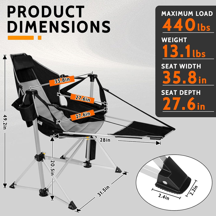 • Adjustable Reclining Backrest:Customize your comfort with the reclining backrest. Move smoothly from upright to laid-back, aided by the padded headrest and detachable footrest. The ultimate swing lounger camp chair for reading, resting, or relaxing outside.
