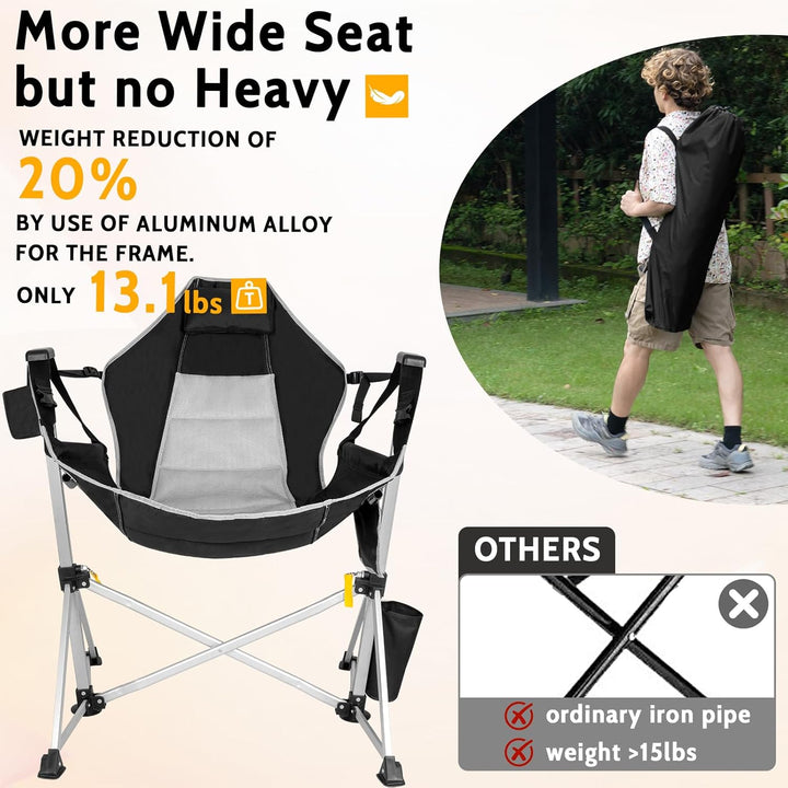 • Strong Yet Lightweight Build:Built from aircraft-grade aluminum and steel, this swinging camping chair holds up to 440 lbs but weighs only 13.1 lbs. Non-slip feet keep it steady on any surface. A tough, portable pick among folding chairs for outside.