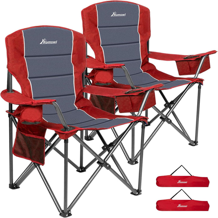 Romswi 2PK Oversized Padded Back Camping Chairs,Heavy Duty Folding Chairs Support 500 LBS with Arm Sport, Cup Holder Cooler Bag, Collapsible Chairs for Outdoor Red