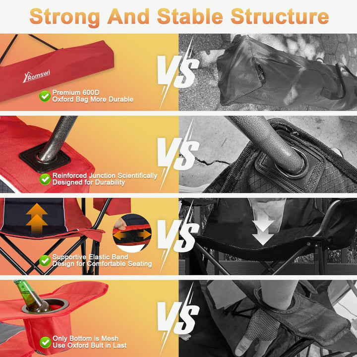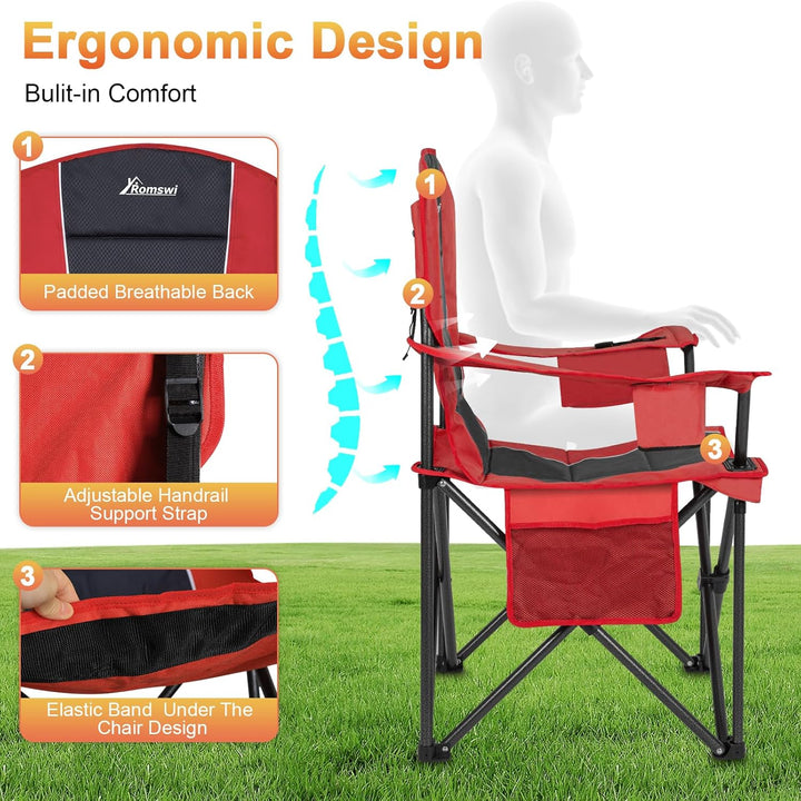 • Romswi 2PK Oversized Padded Back Camping Chairs,Heavy Duty Folding Chairs Support 500 LBS with Arm Sport, Cup Holder Cooler Bag, Collapsible Chairs for Outdoor Red