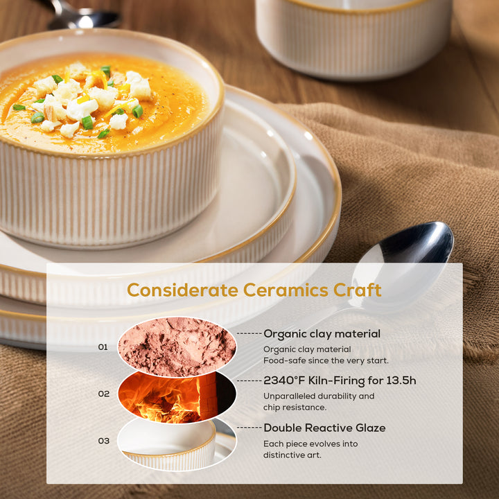 Each piece is kiln-fired at 2340°F for 13.5 hours, resulting in a thick, heavyweight construction that resists chips, scratches, and everyday wear—even when using metal utensils.