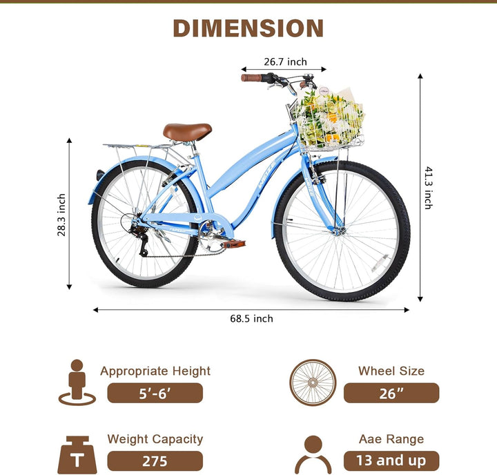 Ride in comfort and style with the WEIZE 26-inch Beach Cruiser. Perfect for men and women, this 7-speed city bike features a durable high-carbon steel frame, front & rear fenders, and an ergonomic upright design. Choose between a rear rack or basket for added convenience. Ideal for beach rides and city commutes, this retro-style cruiser offers a smooth and enjoyable experience. Suitable for beginners and intermediate riders (61" minimum height).