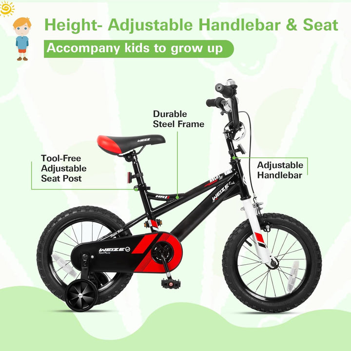 Weize Kids Bike, 14 Inch Children Bicycle for Boy Girl Toddler Age 3-5 Years Old, Rider Height 35"-42", Black Carbon Steel Frame Bikes with Adjustable Seat and Training Wheel