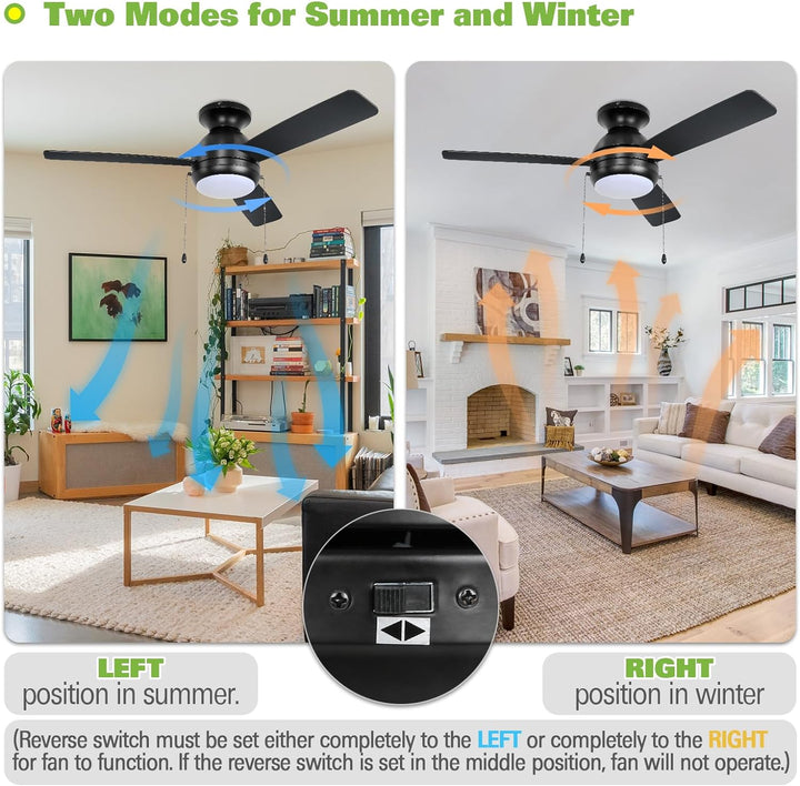 44 inch Flush Mount Ceiling Fan with LED Lights(3000K/4000K/6000K) Pull Chain, Noiseless Reversible Motor, Low Profile Ceiling Fan, 3 Speed, ETL Listed, Black