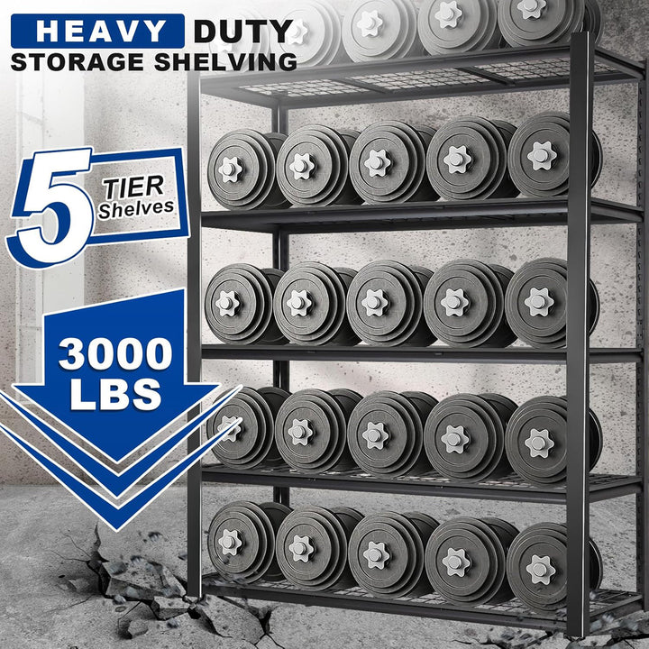 • 5-Tier Storage Shelves – Each shelf holds up to 500 pounds (evenly distributed), with a total maximum load weight of 2500 pounds, making it ideal for garages, basements, workshops, and more.