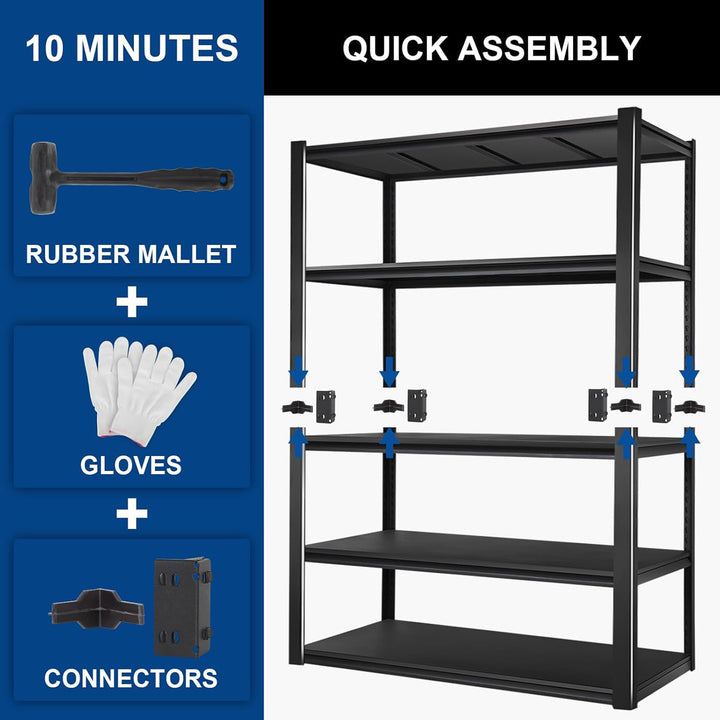 • 5-Tier Storage Shelves – Each shelf holds up to 600 pounds (evenly distributed), with a total maximum load weight of 3000 pounds, making it ideal for garages, basements, workshops, and more.