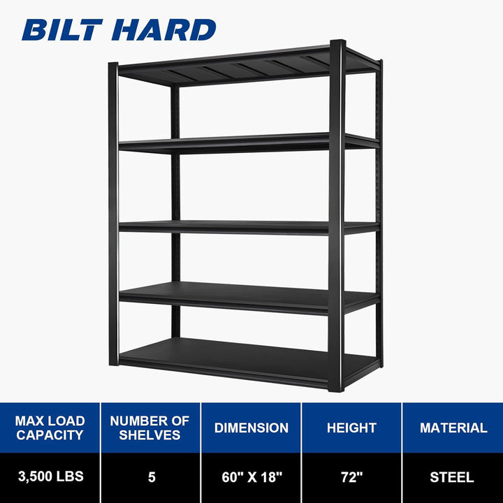 BILT HARD Storage Shelves 3500LBS 5-Tier Heavy Duty 60"W x 18"D x 72"H Garage Shelving Adjustable Metal Shelving Unit Steel Shelves Utility Shelving