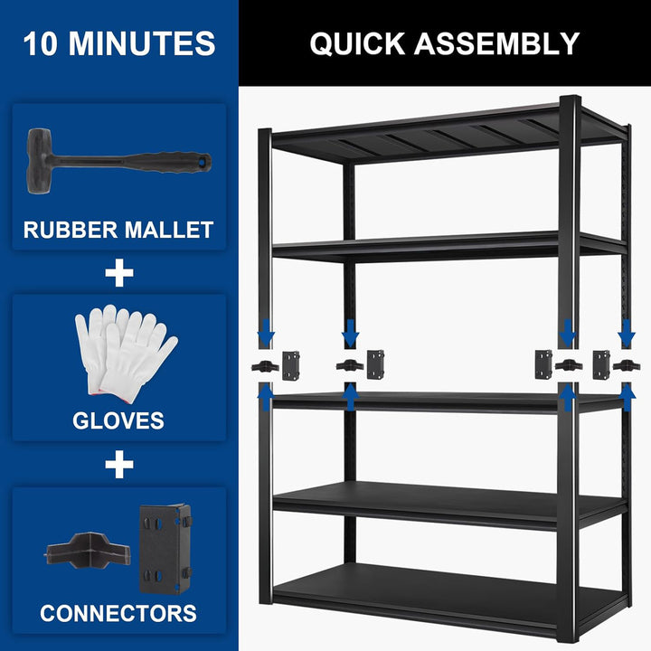 • 5-Tier Storage Shelves – Each shelf holds up to 700 pounds (evenly distributed), with a total maximum load weight of 3500 pounds, making it ideal for garages, basements, workshops, and more.