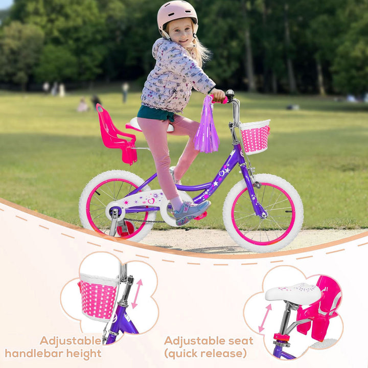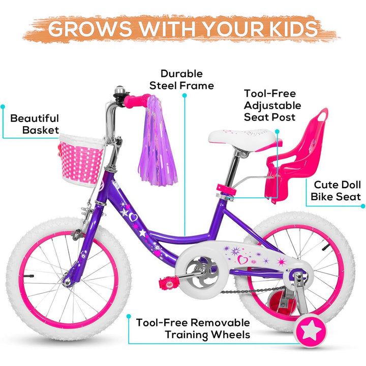 hykolity 16 inch Girls Bike Princess Bicycle for Age 4-7 Years Old Rider Height 41-53 inch includes Training Wheel Basket Doll Seat Violet Purple