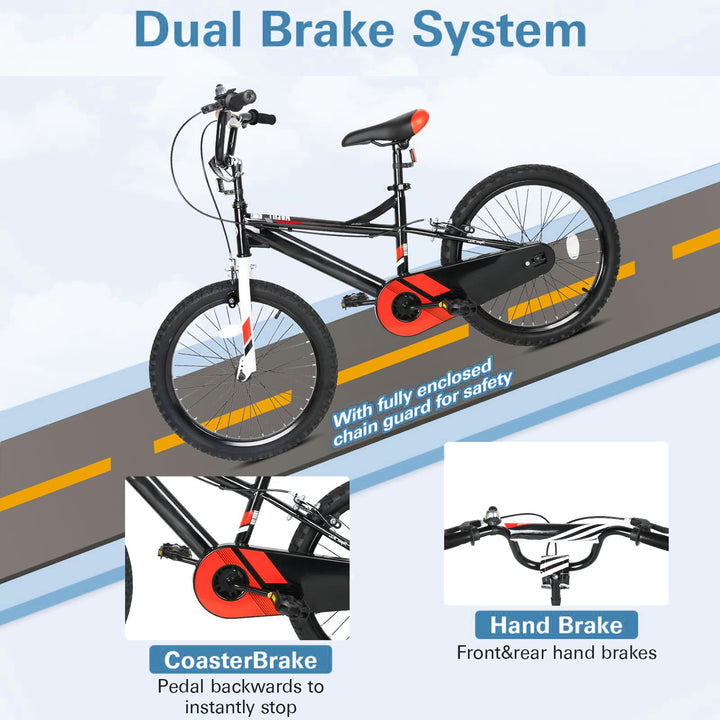 Perfect for boys and girls ages 8 to 12, the Hykolity 20" Mountain BMX Style Youth Boys Girls Bicycle blends safety, performance, and fun. Featuring an adjustable saddle & handler bar, and a powerful dual brake system, it adapts to your child's confidence and skill level. Anti-slip tires, a full chain case, and a sturdy frame ensure a secure and comfortable ride. Includes fun accessories like a crisp bell and bright reflectors for added safety and style.