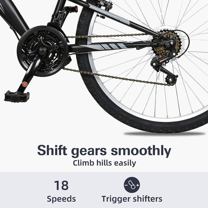 Easily switch gears with 18-speed twist shifters and a rear derailleur, giving you the control you need to tackle hills, rough terrain, or casual rides on the road. This adult sport bike is built for versatility.
