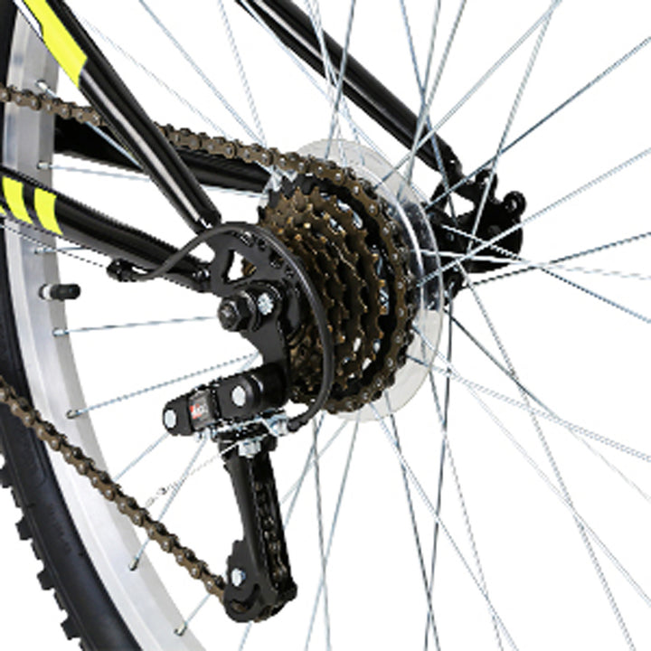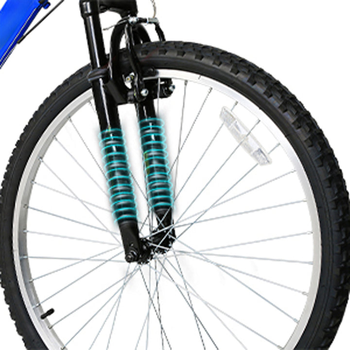 Designed for riders who love the outdoors, this durable steel dual-suspension mountain bike is ready to take on rugged trails, dirt paths, rocky trails, and pavement. With a front suspension fork and rear coil shock, it smooths out bumps so you can enjoy a more comfortable ride.