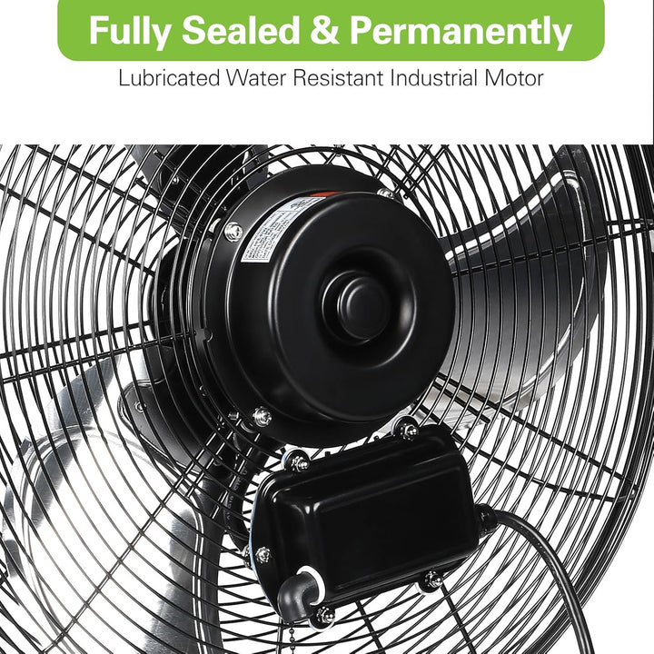 【Durable & Sturdy Build】Crafted with a fully enclosed ball-bearing motor and powder-coated steel housing, this outdoor patio fan effectively shields the motor from workshop debris and dust. Its aluminum fan blades, OSHA-compliant safety grilles, and 9-ft power cord with GFCI plug enhance reliability, while an IPX4 water-resistant rating makes it safe for both indoor and outdoor use, even in damp conditions.