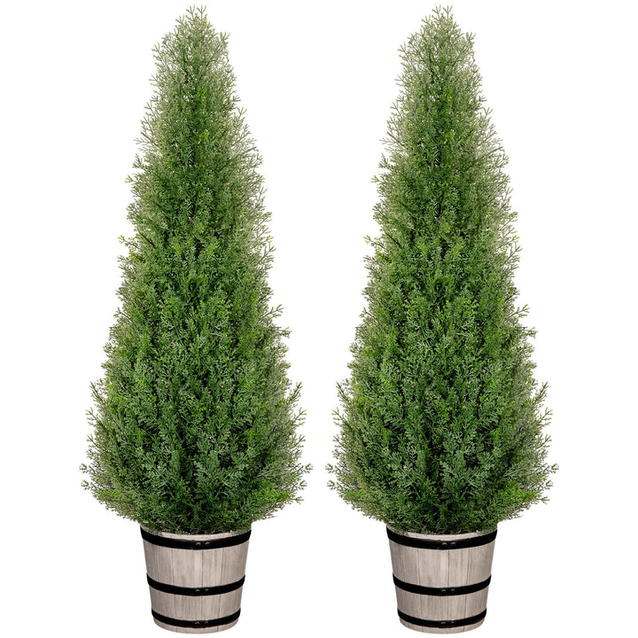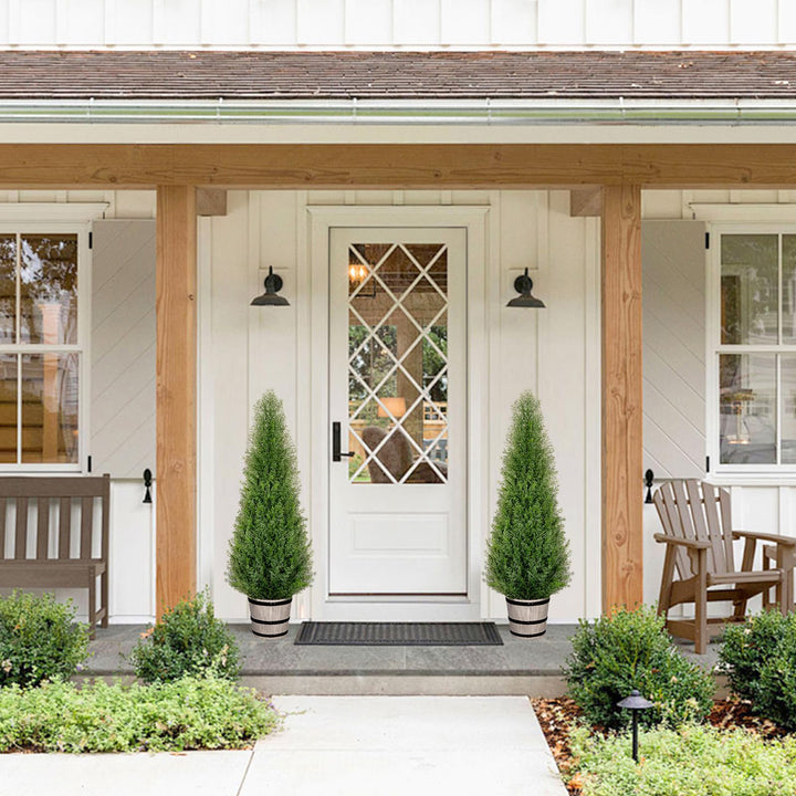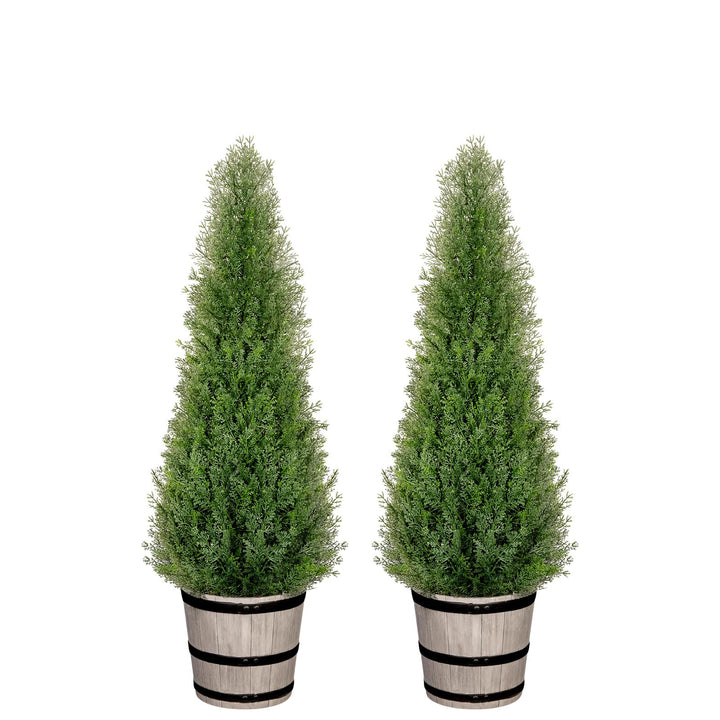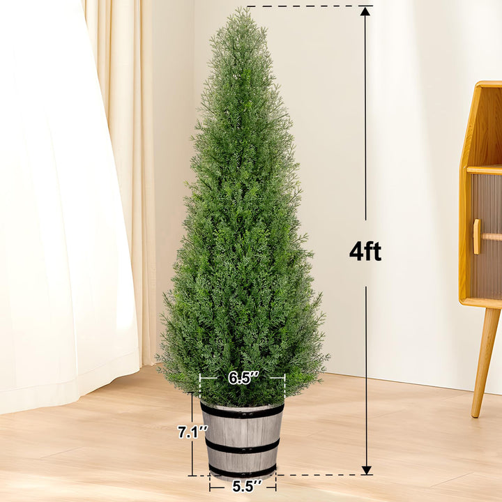 • Hykolity Artificial Cedar Topiary Tree, 3FT 4FT with Barrel Planter, Faux Pine Shrubs Plant, Outdoor Indoor Home Decor Realistic Fake Plants, 2-Pack
