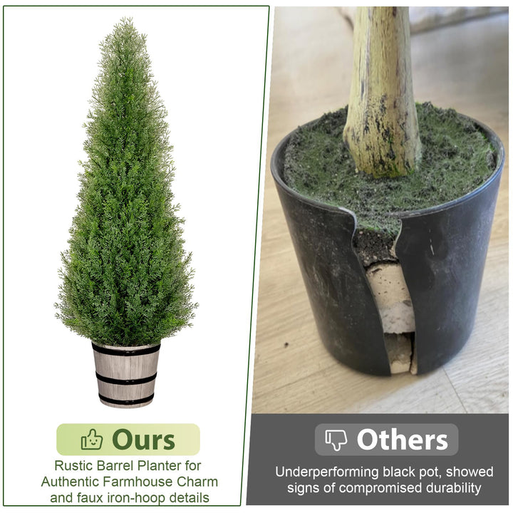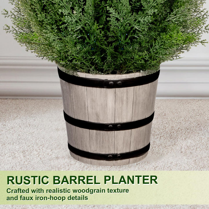 Bring timeless charm to your space with this antique-look barrel planter paired with a lifelike cedar topiary. Designed with realistic woodgrain texture and faux iron-hoop details, the rustic planter mimics the character of aged oak while showcasing vibrant cedar foliage. Unlike ordinary black pots, the barrel design enhances style and elevates the look of porches, entryways, and indoor corners. The maintenance-free topiary requires no watering, pruning, or sunlight, offering year-round greenery with true-to-life texture and natural movement in the breeze. Whether for your living room, office, or outdoor patio, this decorative piece adds warmth and character, making it a thoughtful gift for housewarmings, holidays, and special occasions.