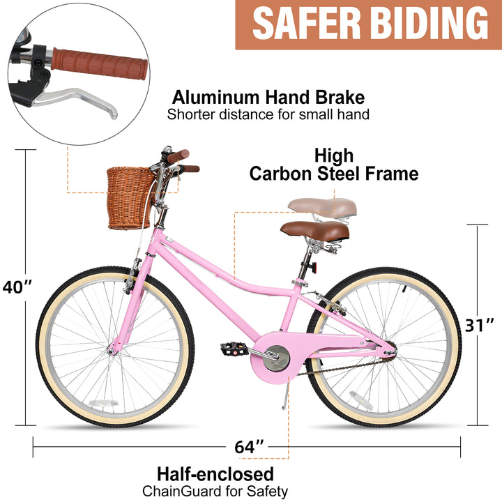 Upgrade your child's ride with this charming Hykolity 24-inch Girls Bicycle, featuring a sweet Retro Style in a vibrant Pink finish. This larger bike is perfectly sized for older children and teens aged 8 to 14 years old. Designed with a lightweight steel frame, it provides a sturdy yet easily manageable ride, making it perfect for enjoyable commutes and relaxed neighborhood cruising.