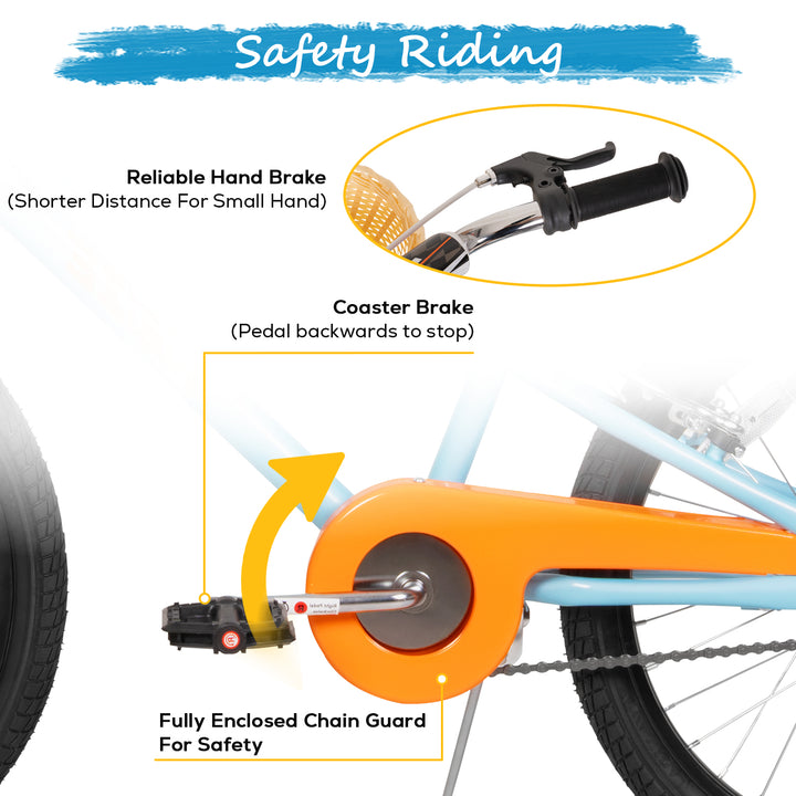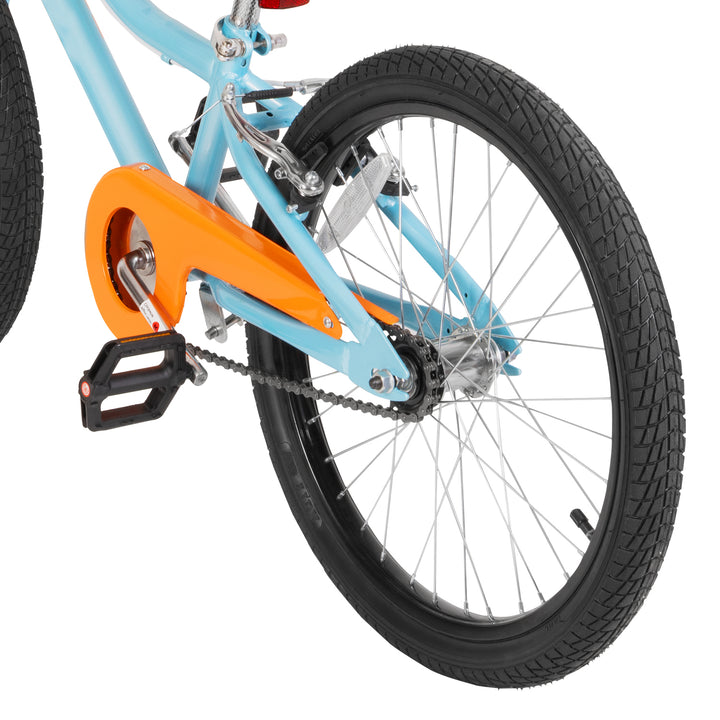 This 20-inch model is equipped with a robust dual braking system to ensure reliable stops. It includes a responsive small hand front brake, specifically designed for smaller hands to easily engage, complemented by an intuitive coaster brake (pedal backward to stop). For maximized protection, the cover chain fully encloses the drivetrain, safeguarding clothing and fingers. A clear-sounding bell is also included to ensure your child can safely alert others while riding.