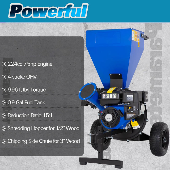 • Powered by a robust 224cc 4-stroke OHV engine delivering 7.5HP and 9.96 ft-lbs of torque this chipper reaches a maximum speed of 4000 rpm and operates with a 15 to 1 reduction ratio which ensures efficient processing of dense yard and forestry debris