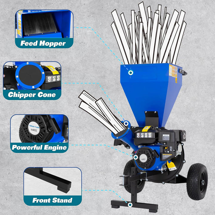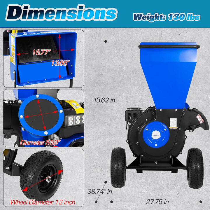 Please kindly note: Use only regular unleaded gasoline with a minimum octane rating of 87 to ensure optimal engine performance & Avoid processing wet wood, vines, pine cones, palm fronds, or petrified wood, as these materials may lead to clogging or mechanical failure.