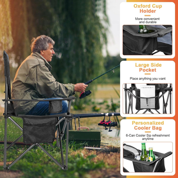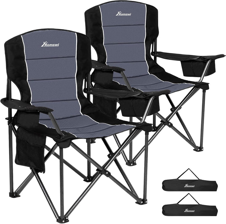 Romswi 2PK Oversized Padded Back Camping Chairs,Heavy Duty Folding Chairs Support 500 LBS with Arm Sport, Cup Holder Cooler Bag, Collapsible Chairs for Outdoor Black