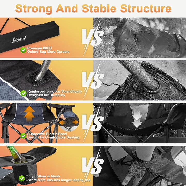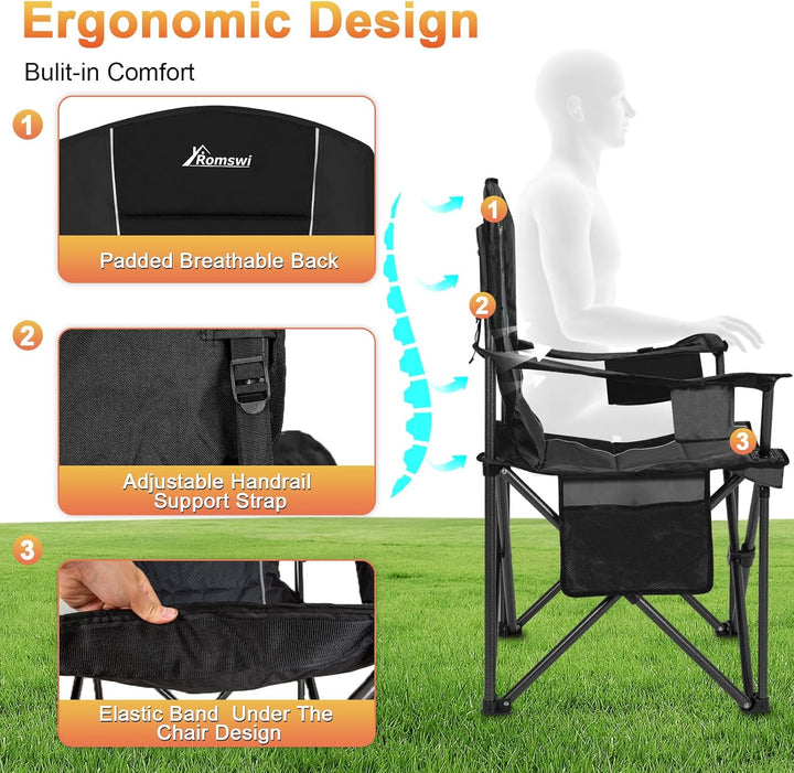 • Romswi 2PK Oversized Padded Back Camping Chairs,Heavy Duty Folding Chairs Support 500 LBS with Arm Sport, Cup Holder Cooler Bag, Collapsible Chairs for Outdoor Black