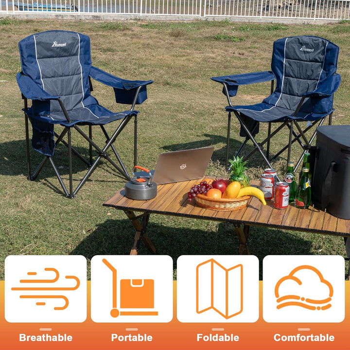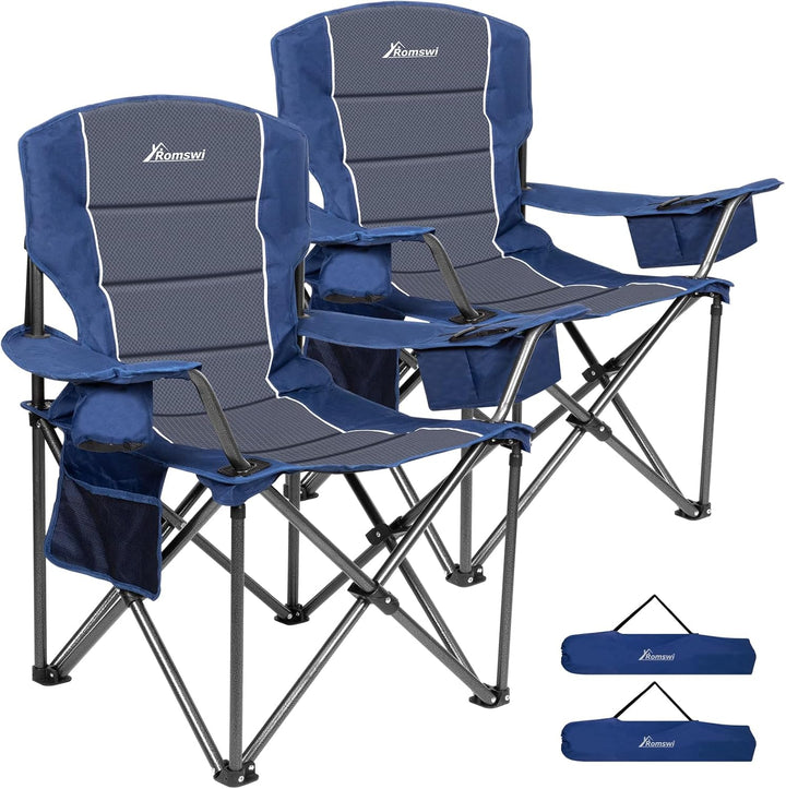 Romswi 2PK Oversized Padded Back Camping Chairs,Heavy Duty Folding Chairs Support 500 LBS with Arm Sport, Cup Holder Cooler Bag, Collapsible Chairs for Outdoor Blue